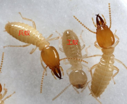 兵蟻是白蟻群體中變化較大的品級(jí),除少數(shù)種類缺兵蟻外,一般從3~4齡幼蟻開(kāi)始,部分幼蟻分化為色澤較淡的前兵蟻,進(jìn)而成為兵蟻。
