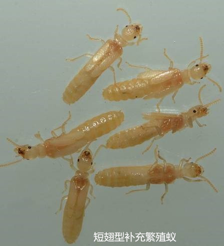 補(bǔ)充繁殖蟻有兩類:短翅型(或稱成蟲(chóng)第二型)和無(wú)翅型(或稱成蟲(chóng)第三型)。此種現(xiàn)象在較高級(jí)的白蟻科昆蟲(chóng)的巢中比較少見(jiàn)。